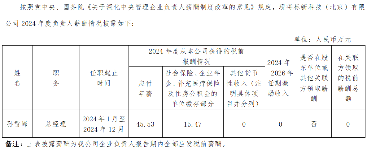 標(biāo)新科技(北京)有限公司企業(yè)負(fù)責(zé)人2024年度薪酬情況