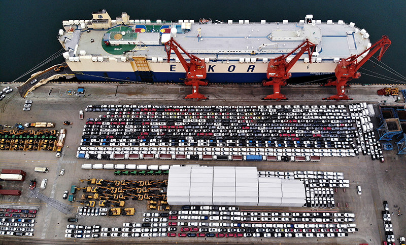商品車在山東港口青島港碼頭等候裝船(2022年8月7日攝,無人機照片)。新華社記者 李紫恒 攝