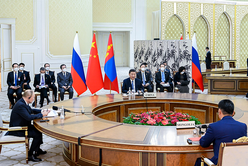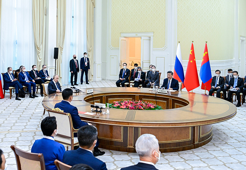 當?shù)貢r間9月15日下午,國家主席習(xí)近平在撒馬爾罕國賓館同俄羅斯總統(tǒng)普京、蒙古國總統(tǒng)呼日勒蘇赫舉行中俄蒙三國元首第六次會晤。新華社記者 翟健嵐 攝