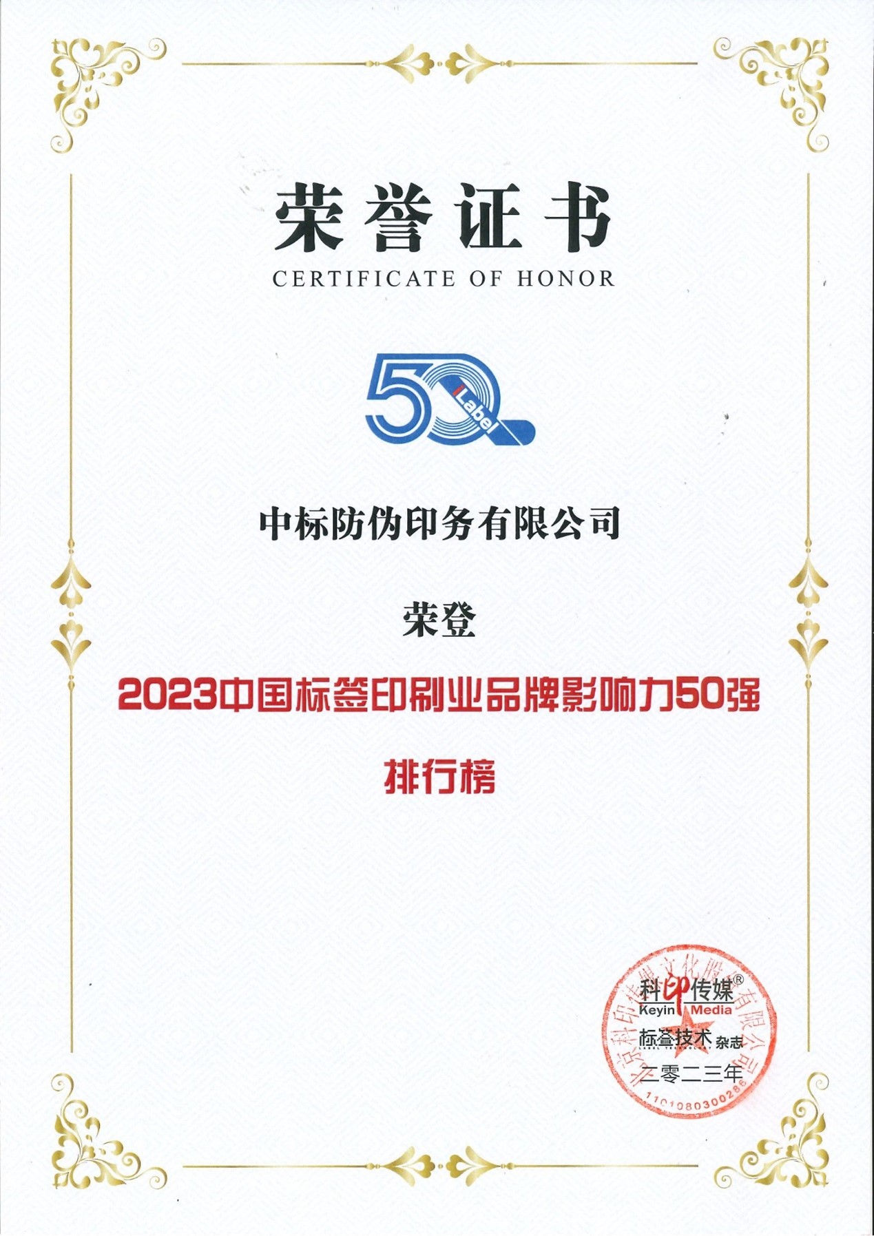 11月1日, “2023標(biāo)簽印刷業(yè)品牌影響力50強(qiáng)”頒獎典禮在上海舉辦,大會同期發(fā)布了“2023標(biāo)簽印刷業(yè)品牌影響力50強(qiáng)”企業(yè)榮譽(yù)榜單。中標(biāo)防偽的企業(yè)資質(zhì)、獲獎情況和行業(yè)影響等綜合能力得到評委會專家的一致認(rèn)可,連續(xù)兩年獲評“中國標(biāo)簽印刷業(yè)品牌影響力50強(qiáng)”。通過參評,中標(biāo)防偽提升了品牌影響力,增強(qiáng)了產(chǎn)品競爭力,促進(jìn)公司轉(zhuǎn)型高質(zhì)量發(fā)展。
