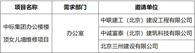根據(jù)《中國標(biāo)準(zhǔn)科技集團(tuán)有限公司采購工作管理辦法(試行)》的要求,現(xiàn)對中標(biāo)集團(tuán)辦公樓樓頂女兒墻維修采購項目競爭性談判邀請單位進(jìn)行公示。
