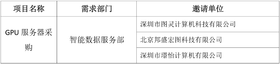 按照《標(biāo)新科技(北京)有限公司采購工作管理辦法(試行)》要求,現(xiàn)對(duì)“GPU服務(wù)器采購”項(xiàng)目競(jìng)爭性談判邀請(qǐng)單位進(jìn)行公示。